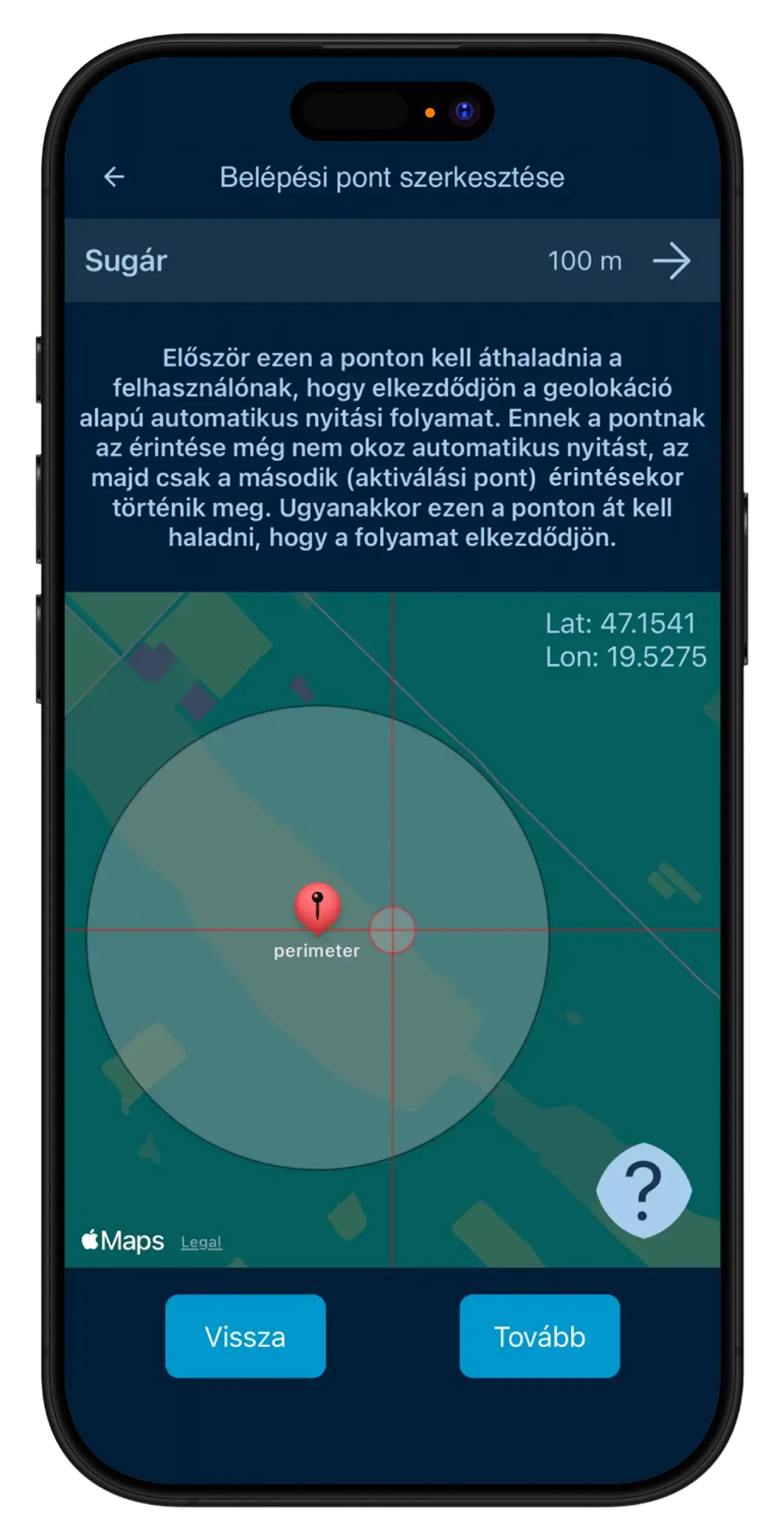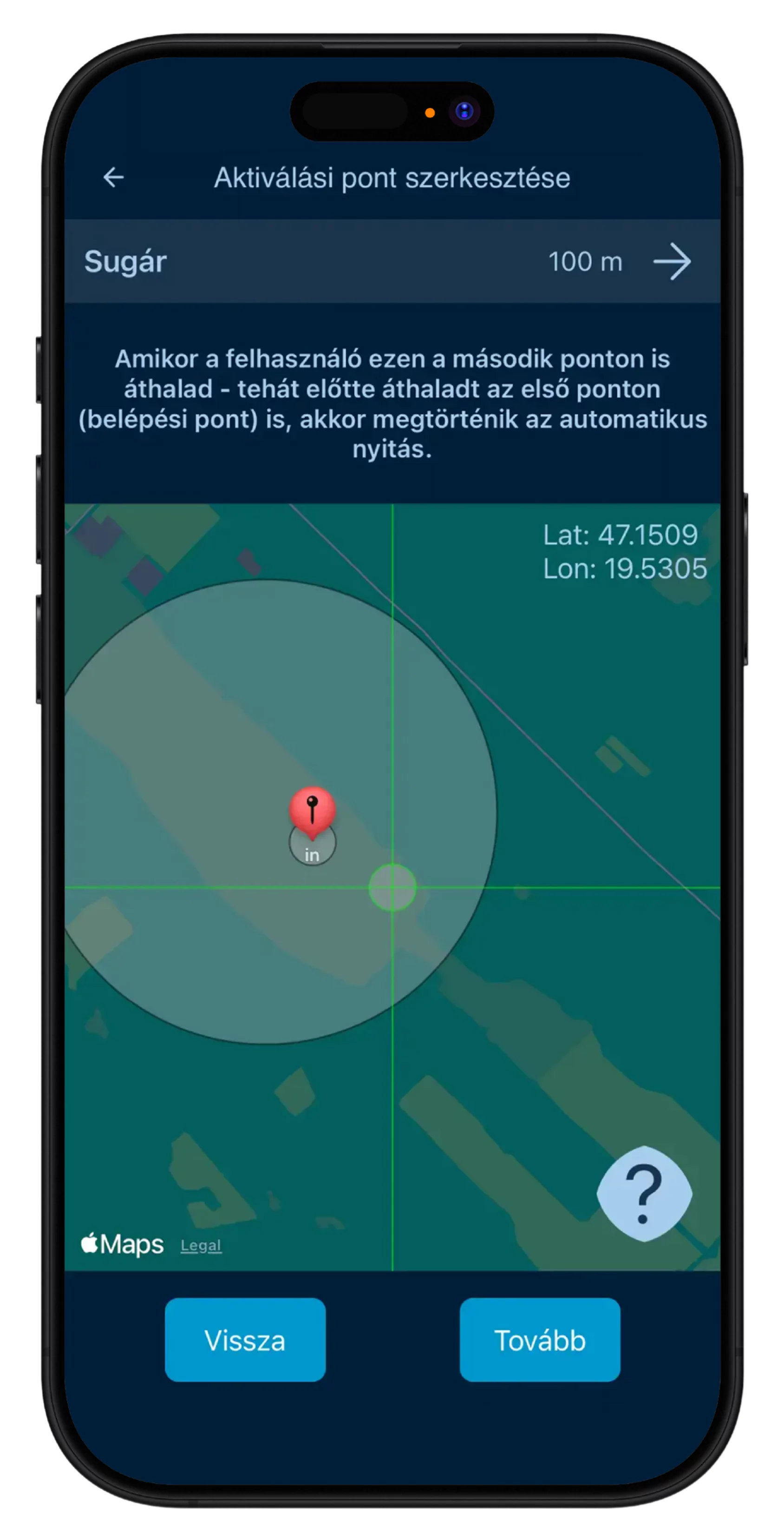 Add meg azt az első területet (sugarú kört), ahol először át kell haladnod ahhoz, hogy a folyamat elkezdődjön. Ennek a pontnak az érintése még nem okoz automatikus nyitást, az majd csak a második (aktiválási pont) érintésekor történik meg.