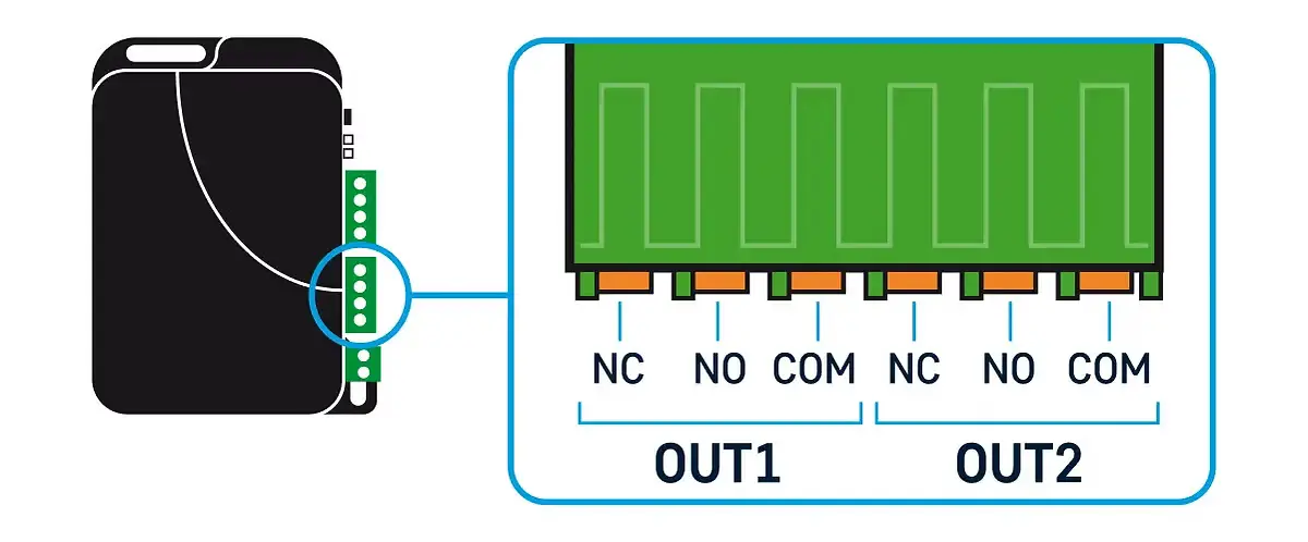 Az OUT kimenetek NC termináljain nyugalmi helyzetben zárt kontaktus van a COM felé, míg az NO termináljain nyugalmi helyzetben nyitott kontaktus (szakadás) van a COM felé.
