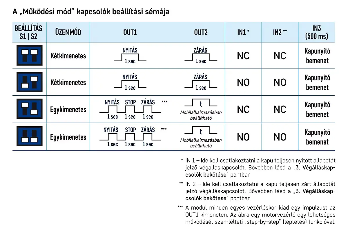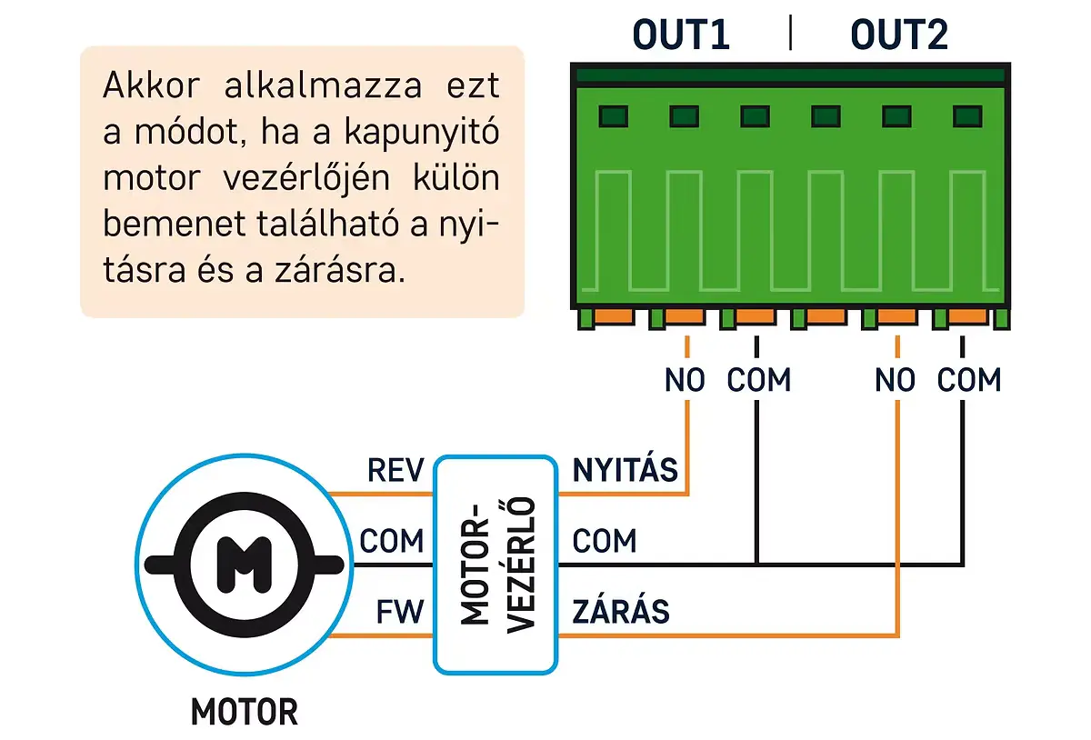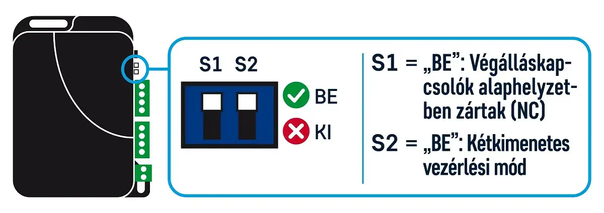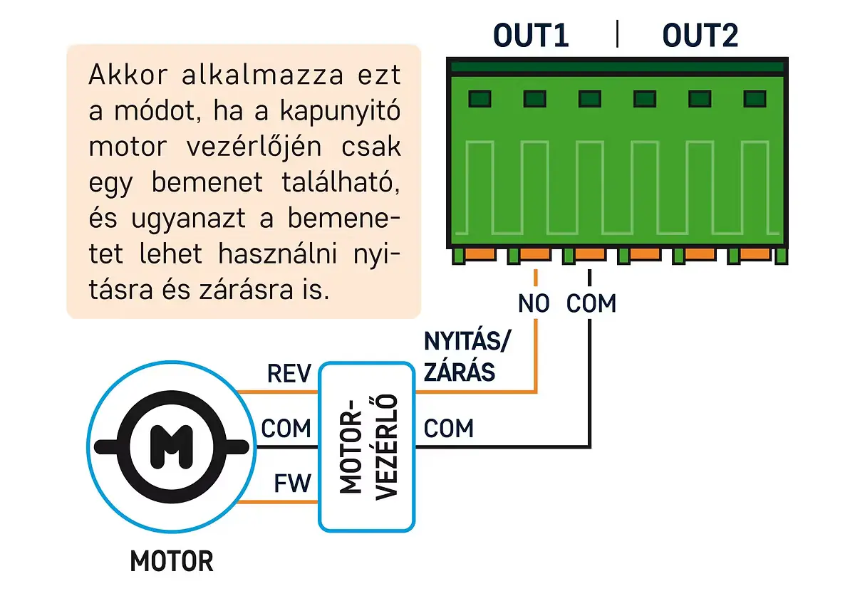 Amennyiben a motorvezérlőnek csak egy vezérlőbemenete van, akkor az S2 kapcsolót állítsd az alsó „KI” állásba. Ebben a vezérlési módban az OUT1 kimenet szolgáltatja a vezérlőimpulzust mind a nyitáshoz, mind a záráshoz, az OUT2 kimenet pedig a mobilalkalmazásban beállítható időtartam erejéig aktiválva marad minden egyes vezérléskor. Az OUT2 kimenet olyan motorvezérlőknél használható, amelyek hosszabb vezérlőimpulzust igényelnek a nyitáshoz / nyitva tartáshoz, de alkalmas lehet kapuvilágítás vezérlésére is.