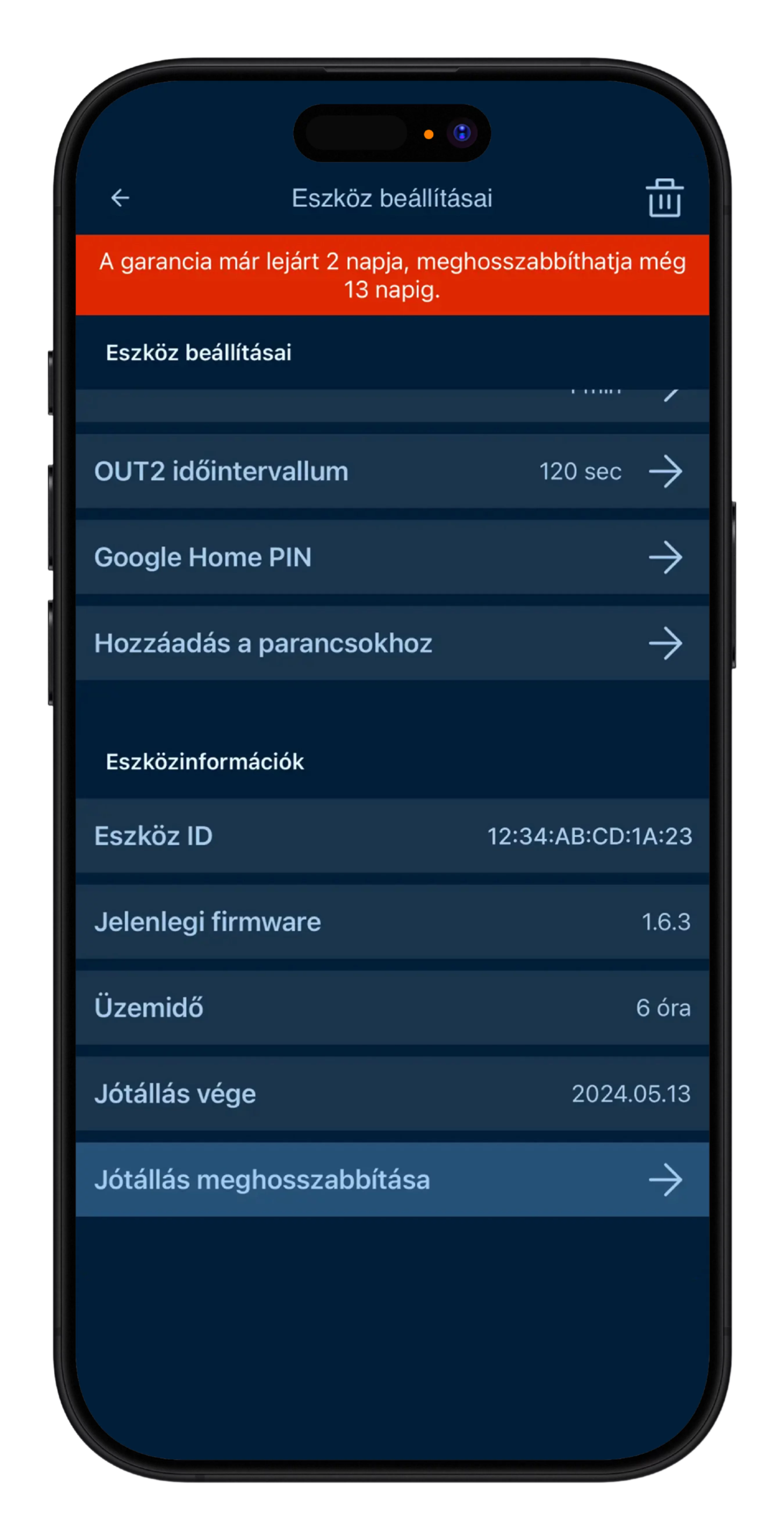 A mobilalkalmazásban a garancia lejárta előtt 60 nappal egy figyelmeztető üzenet jelenik meg az eszköz tulajdonosa számára az irányítópanel alatt (sárga, majd 30 nappal a lejárat előtt piros háttérszínnel), amely tájékoztatja a felhasználót a garancia meghosszabbításának lehetőségéről.