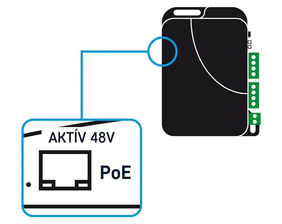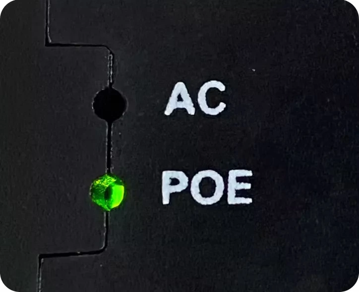 Sikeres, 48 V-tal ellátott bekötés esetén az eszköz oldalán látható PoE felirat melletti LED zölden fog világítani.